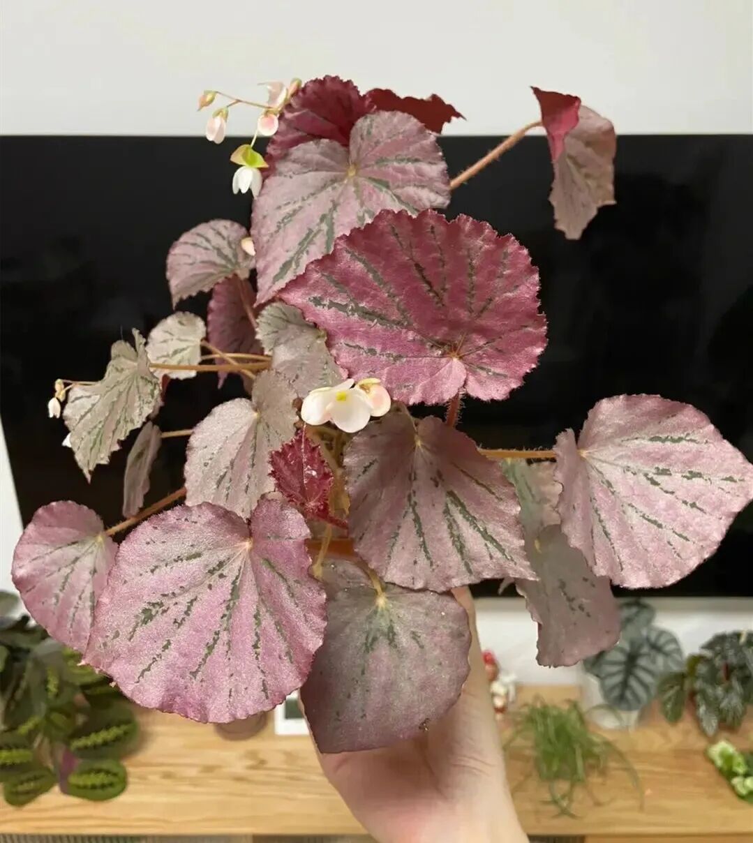 Of Tabby Begonia The plant shape is small and pleasant, Dark reddish brown leaves with irregular green patches (Like tabby pattern) , the leaf edge also has tiny fluff, which is delicate and cute, and also has a somewhat magical sense of sight, open Small pink and white flowers.