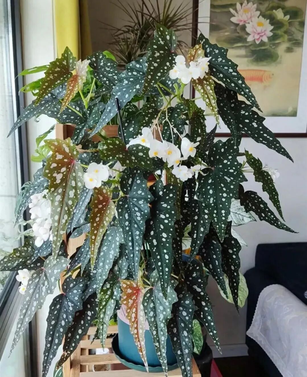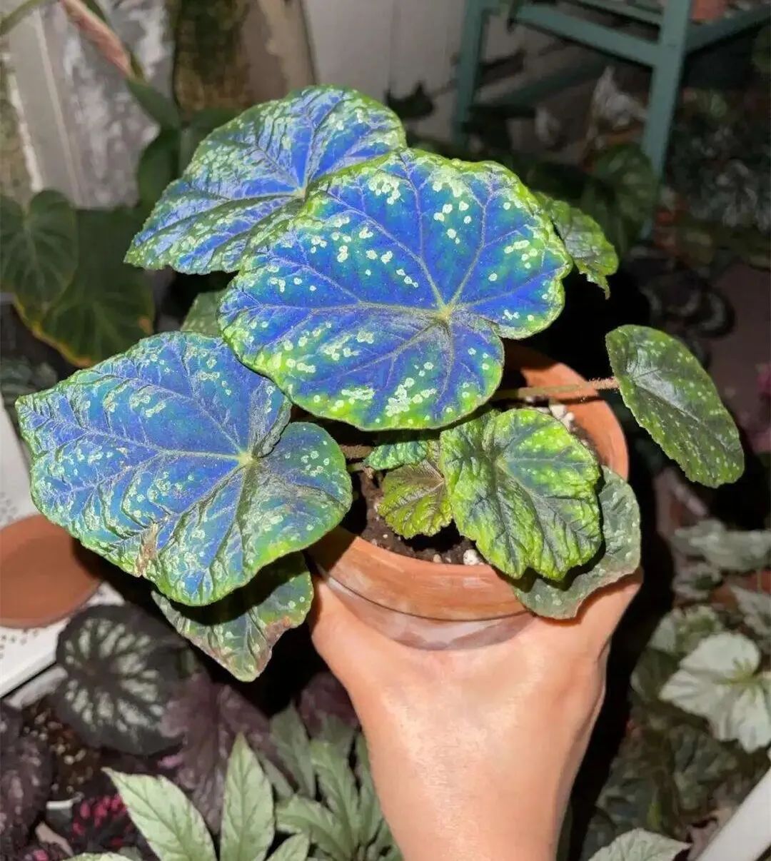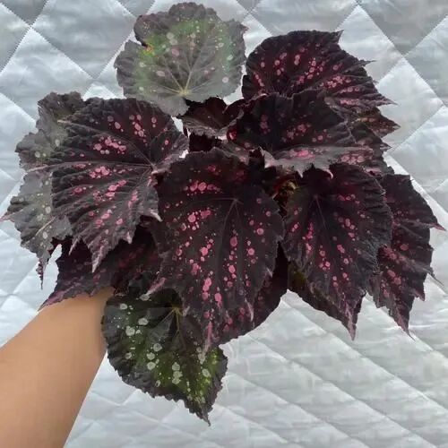 The leaves of Mr. Garden's begonia are large, thick and purple-black (It has satin-like luster under the light, and it is dark and blue) , the leaf cloth has white to pink round spots of varying sizes.