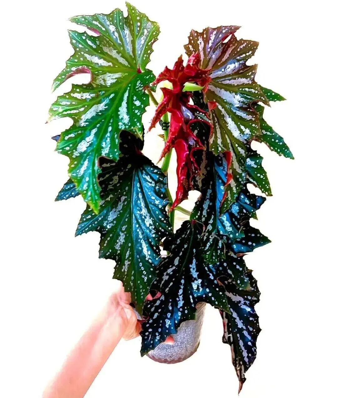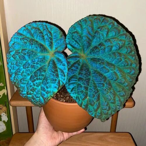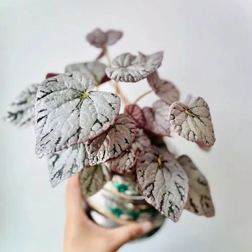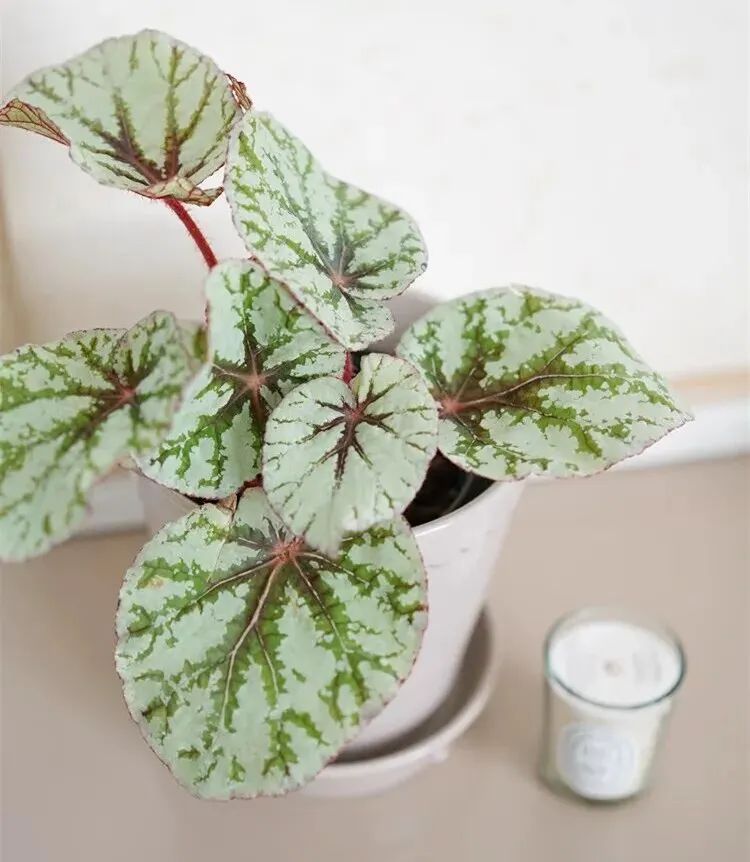The leaves of Fedor begonia are oval, Leaf surface is Silver white (When the light is sufficient, the silvery-white parts are more and whiter) , The veins are green (Dark veins will turn blue) , the leaf stalks are red.