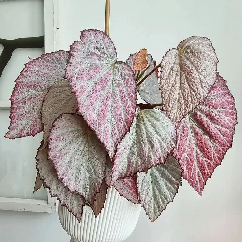 The leaves of Asura begonia are feather-shaped, with slightly serrated leaf margins, and the silver-pink leaves are covered with brown-black veins. There are red cracks in the center of the leaves.