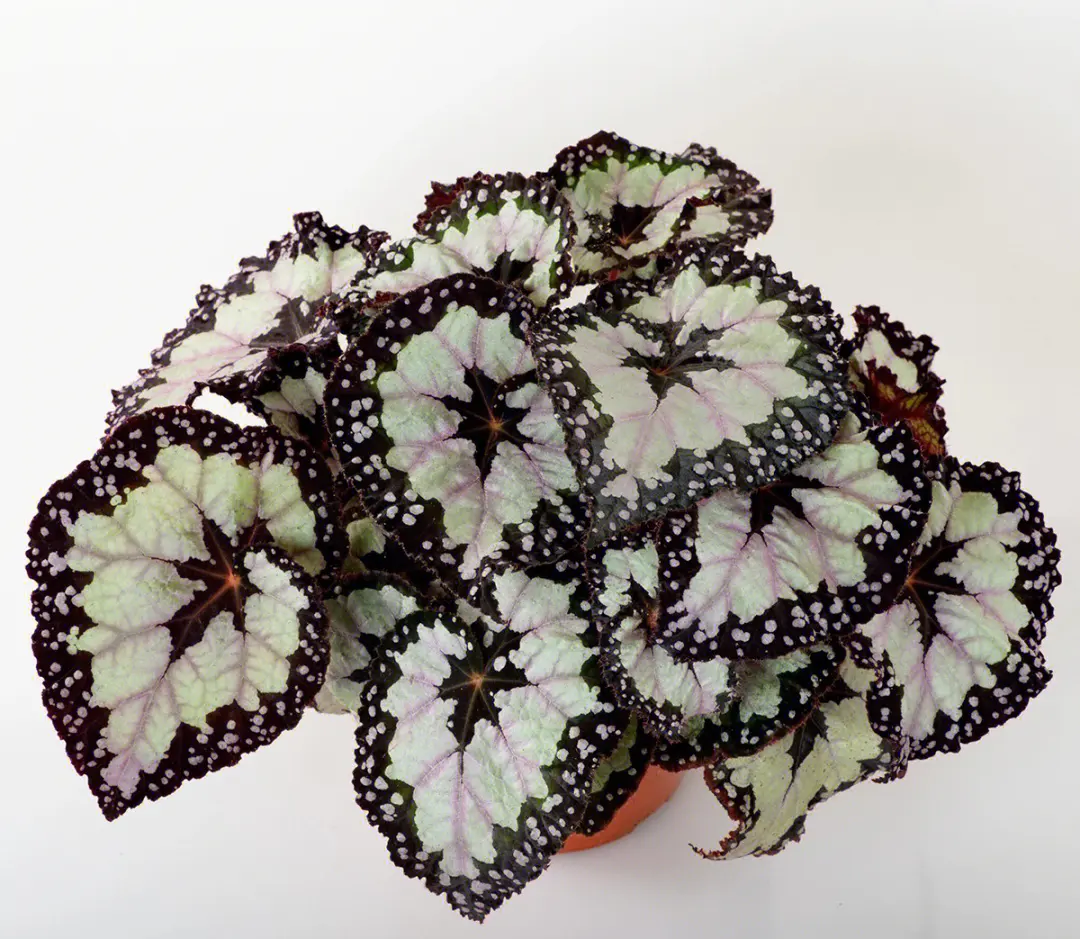 The leaf color of Dolcebitta begonia is bold and striking, with a large area of silver in the middle, a black radial patch in the center, and an outer edge (leaf margin) Parts are green to black wide-sided (slightly wrinkled with silver spots) 。