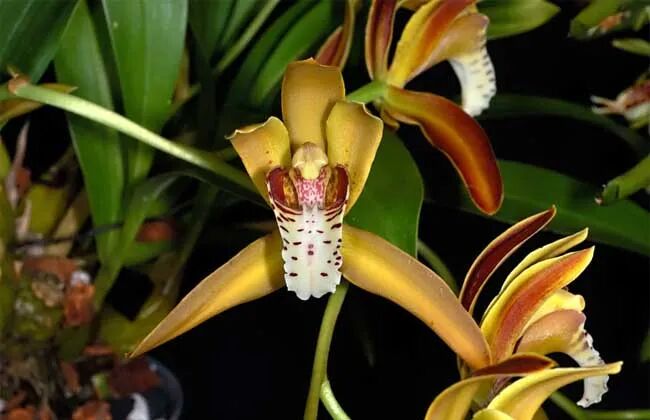 A plant of the genus Orchidaceae, having large, thick flowers, Pale yellow petals and sepals with reddish-brown horizontal stripes stretch all around, like a mysterious poisonous spider.