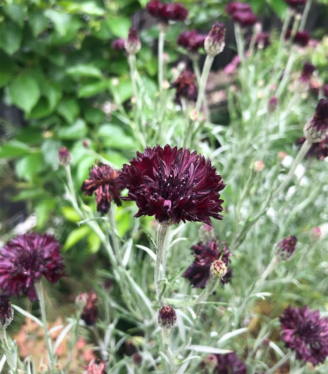 The "black ball" cornflower has a dark red color that is nearly black, Semi-double petal Presents a tubular bloom with five lobes at the top, Ingenious Dark color The flowers are in very sharp contrast with the "silver leaves" with silver hairs and are full of personality.