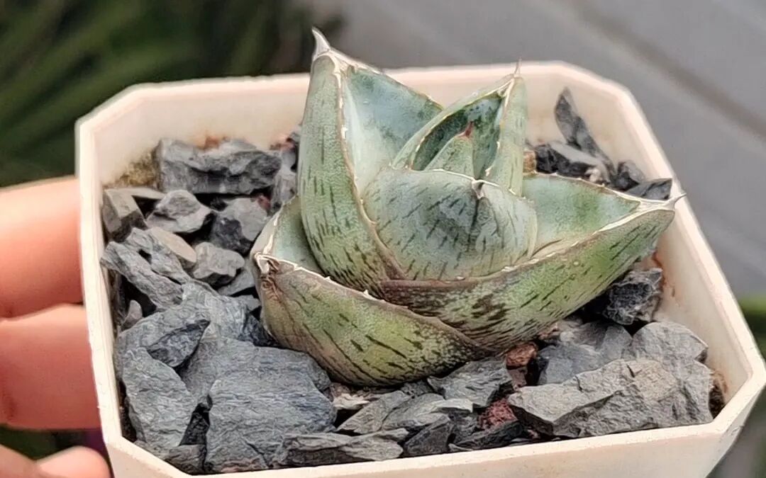 Princess Thor White Middle Spotted Agave is A small brocade variety of Agave grim, with short and wide thick fleshy leaves, which are crab shell-shaped; The leaves are turquoise or blue-green in color, covered with thin white powder, and there are milky white brocade spots in the middle of the leaves; There are sparse fleshy teeth on the leaf margin, yellow or reddish-brown short thorns on the tooth ends, and a short thorn on the top of the leaf.