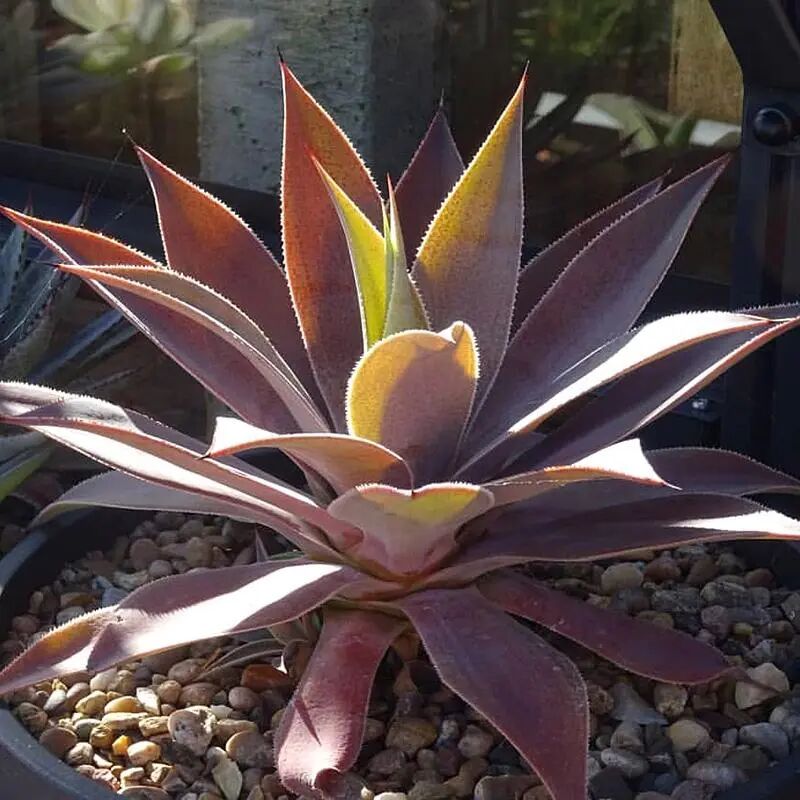 The plant width of Agave Longlei can reach 30 cm, and the leaves are also Not too thick, triangular cone-shaped (Round convex on the back, concave on the inner side of the blade) , the surface of the leaves is covered with a small amount of white powder; The leaf margin has beautiful purple-red horny edges with serrated thorns, There are reddish-brown hard spines at the top of the leaves.