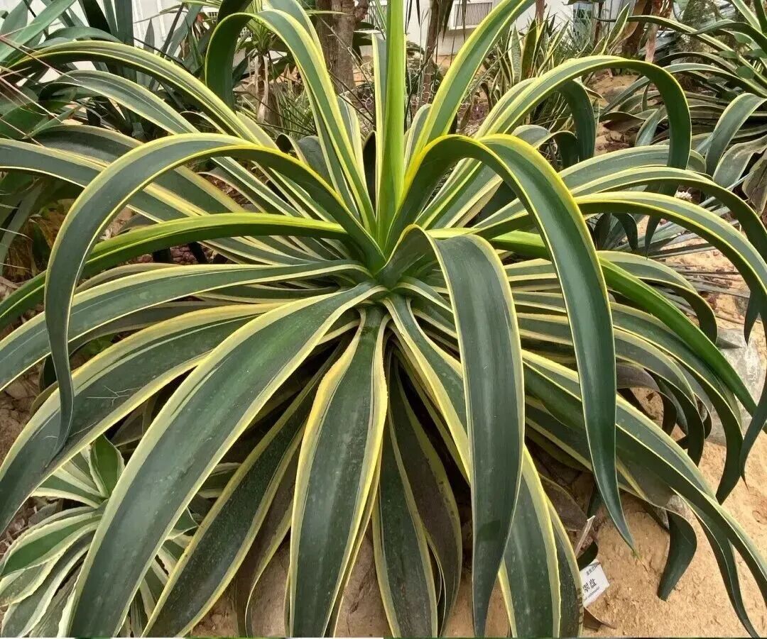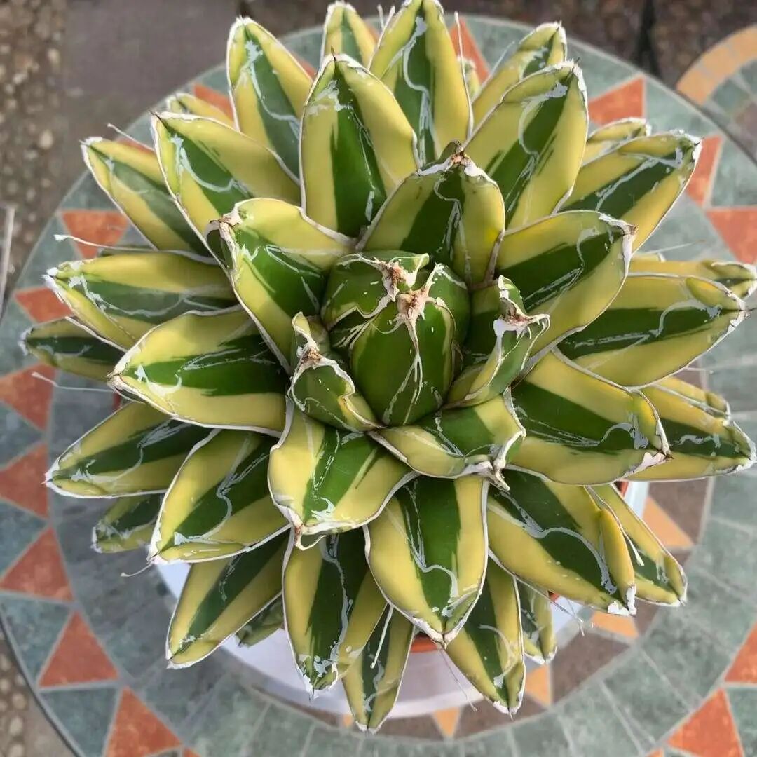 Five-colored Bandai Agave, also known as "Five-colored Bandai Brocade Agave" and "Five-colored Bandai Agave", is a precious variety of agave. Its fleshy leaves are sword-shaped to lanceolate, with hard and tough leaves, and slightly concave in the middle; The middle of the leaves is yellow-green, the two sides are dark green, and the outermost is yellow. The leaf color contrasts strongly; Leaf margin wavy with short brown spines , there are brown hard thorns at the leaf tips.