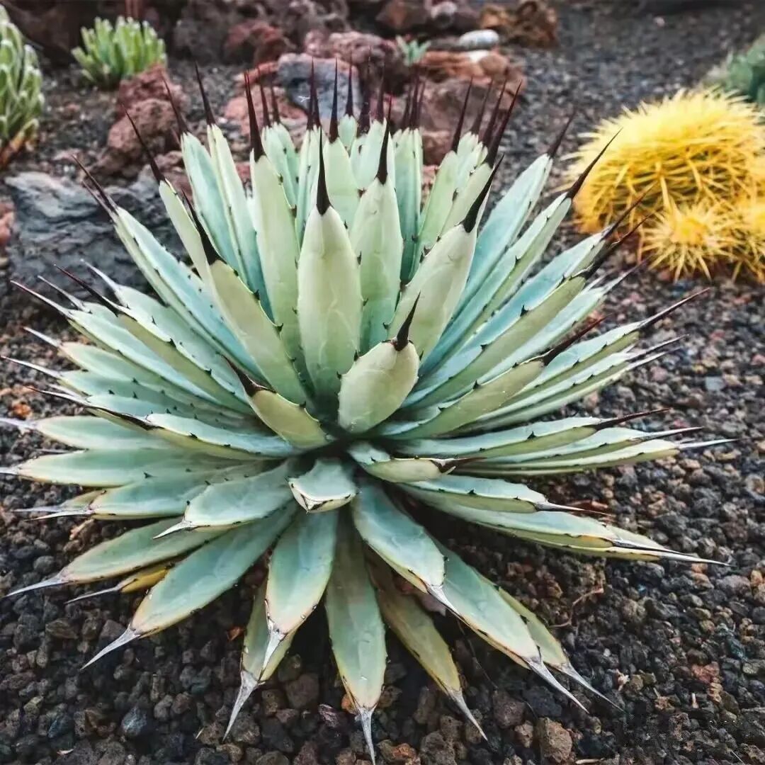 Agave Laiguang, also known as "brown thorn agave", has a plant width of about 1 m and waxy leaves Short and wide, showing Blue-gray-green; The leaf margin has smaller thorns, Large red thorns at the leaf tips.