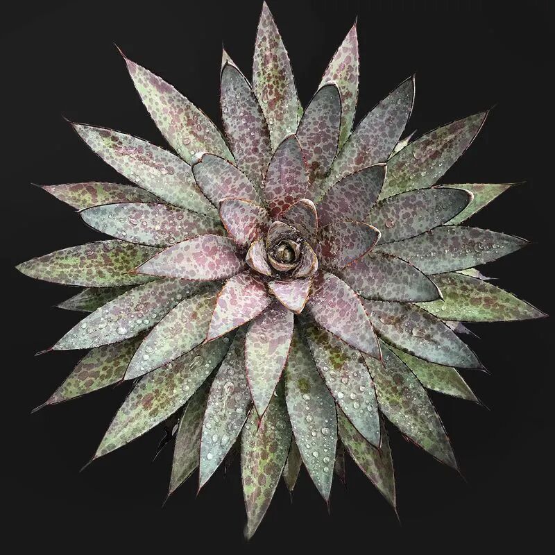 The flat fleshy leaves are gentle smoky purple, sometimes one and two-color (The part less exposed to sunlight is gray-green) , the surface of the leaves is covered with purple round spots; The leaf margin is densely covered with small cream-colored spines, and the leaf tip has soft brown spikes.