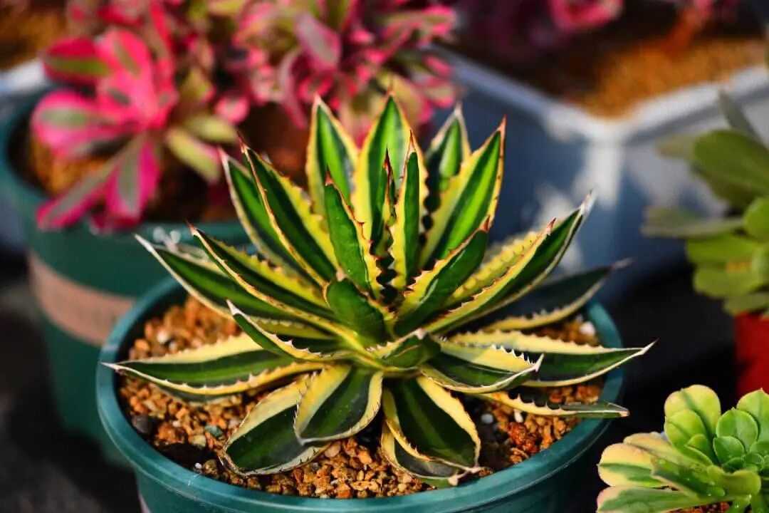 Auspicious Tianjin Agave is The brocade variety of auspicious agave, The plant width is 20-30 cm. its meat quality blade Inverted broad ovate, leaf surface It is covered with white powder, and the leaves are turquoise or gray-green; There are yellow and white stripes on the margin or center of the leaf, The margin of the leaf has dark brown short teeth, and the tip of the leaf has reddish brown hard spines.