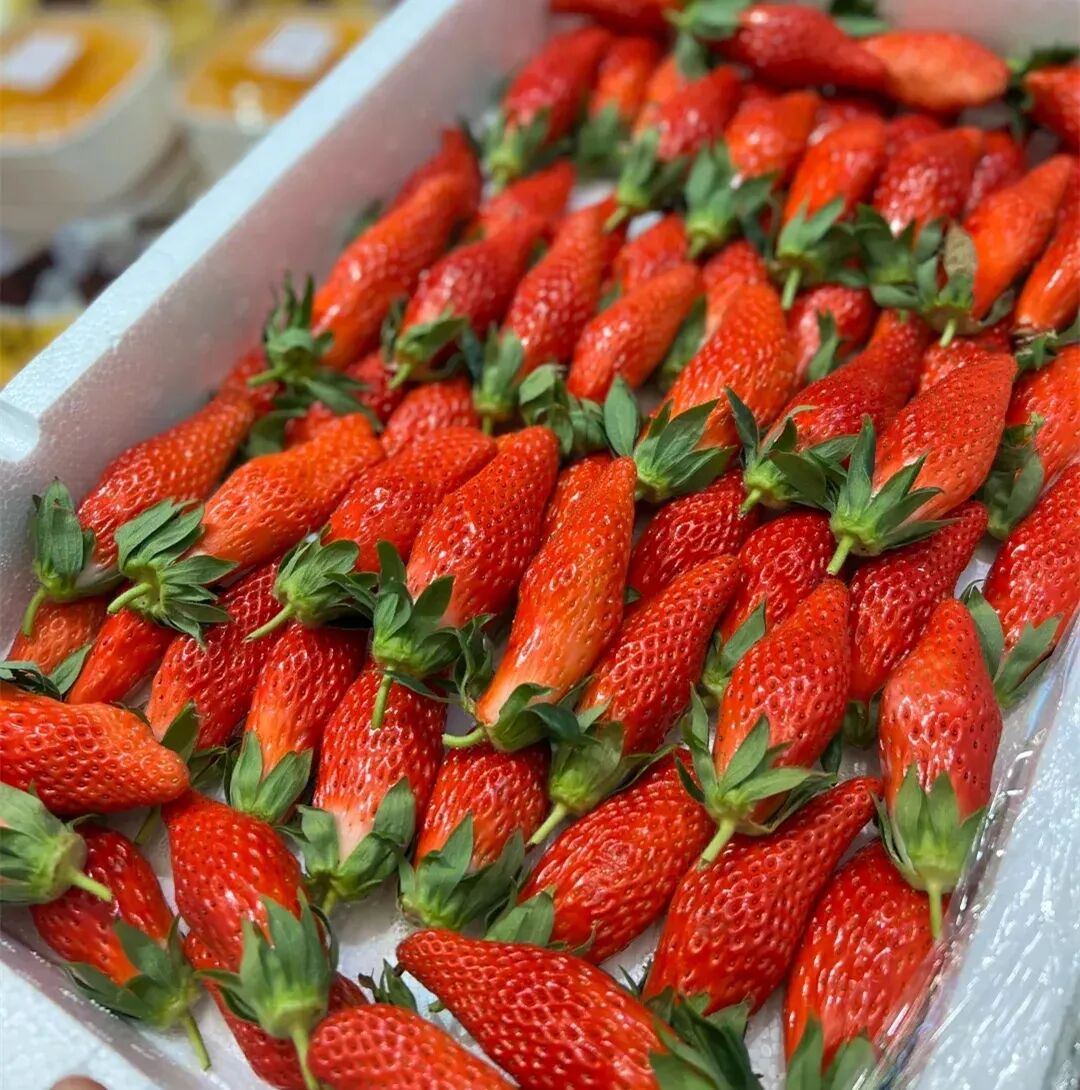 Different from the conical fruit shape of ordinary strawberries, Zhangji's fruit shape is slightly slender, the fruit surface is bright red, and the taste is Extremely Tender and soft, The sweetness is pure and rich, Have fresh Creamy aroma.
